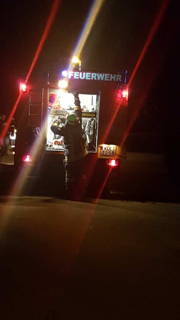 Gegen zwanzig vor zwölf kam dann der dritte Einsatz hinzu: In Rindern wurde eine brennende Baustellentoilette an der Hohen Straße gemeldet. Beim Eintreffen des Löschzugs Rindern stand diese in Vollbrand. Ein Trupp unter Atemschutz konnte das Feuer zügig mit der Schnellangriffsleitung löschen und das Übergreifen auf den nahegelegenen Bauwagen verhindern. Die Polizei ermittelt wegen Brandstiftung.