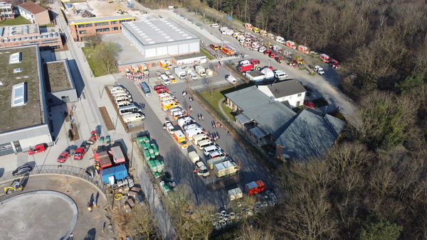 - 2021-03-31 09:50 Uhr Auch der Bereitstellungsraum hinter dem Berufskolleg ist einsatzbereit. Von hier aus wird u. A. der Transport der Personen koordiniert, die den Absperrbereich nicht eigenständig verlassen können. Die Sondierung des Fundortes verzögert sich leider gerade noch etwas.