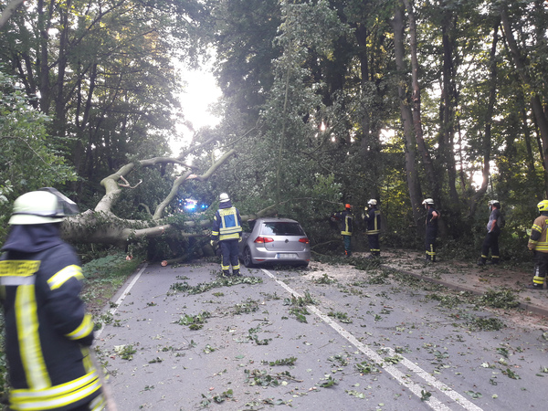 Eine Autofahrerin war gestern Abend (28. Juli 2021) auf der Uedemer Straße Richtung Kleve unterwegs, als eine mächtige Buche auf ihr Fahrzeug stürzte. Die Frau konnte das Fahrzeug eigenständig verlassen. Die Uedemer Straße war über Stunden in beide Richtungen voll gesperrt.
