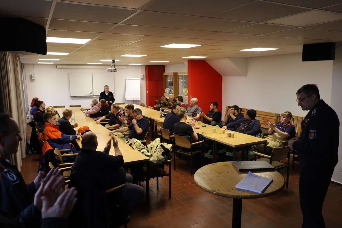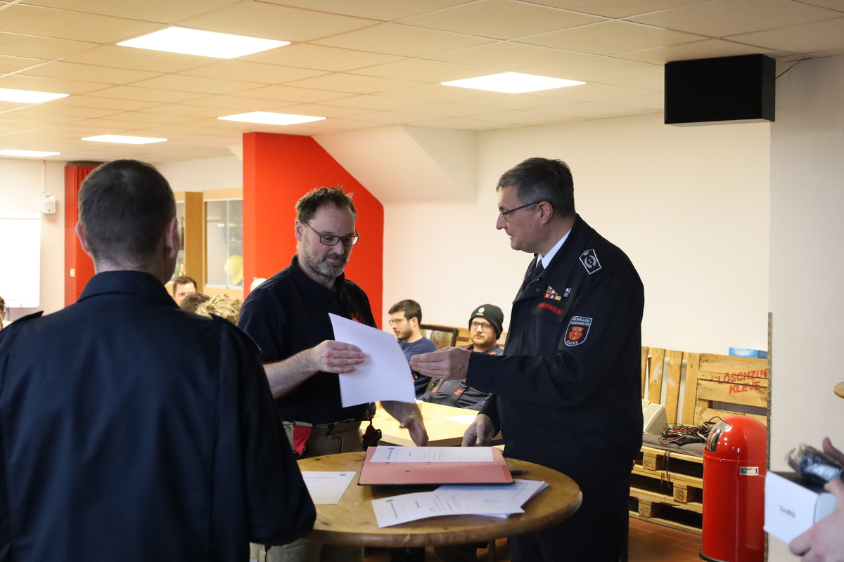 Der Lehrgang endete mit einer theoretischen und einer praktischen Prüfung. Besonders erfreulich war die außergewöhnlich hohe Anzahl an „sehr guten“ Ergebnissen, die bei der Abschlussprüfung erzielt wurden. Die Ausbilder lobten die Gruppe ausdrücklich für ihre disziplinierte Vorbereitung und die engagierte Teilnahme an den Ausbildungsmodulen. „Ich kann mich nicht daran erinnern, dass wir mal so viele Einsen hatten“, staunte Jürgen Buil, Ausbildungsleiter bei der Feuerwehr Kleve. Dies sei ein gutes Zeichen für die Zukunft der Feuerwehren in Kleve und Kranenburg. Andreas Thelosen, Leiter der Feuerwehr Kranenburg gratulierte den Teilnehmern und lobte die gute Zusammenarbeit der Gemeinden bei der Ausbildung. Ralf Benkel, Leiter der Feuerwehr Kleve gab den Feuerwehrleuten noch eines mit auf den Weg: „Egal wie ihr das Gelernte anwendet, schaut bitte im Einsatz immer mal nach links und rechts zu Euren Kameradinnen und Kameraden. Das wichtigste ist, dass ihr immer alle gemeinsam und gesund wieder nach Hause kommt.“