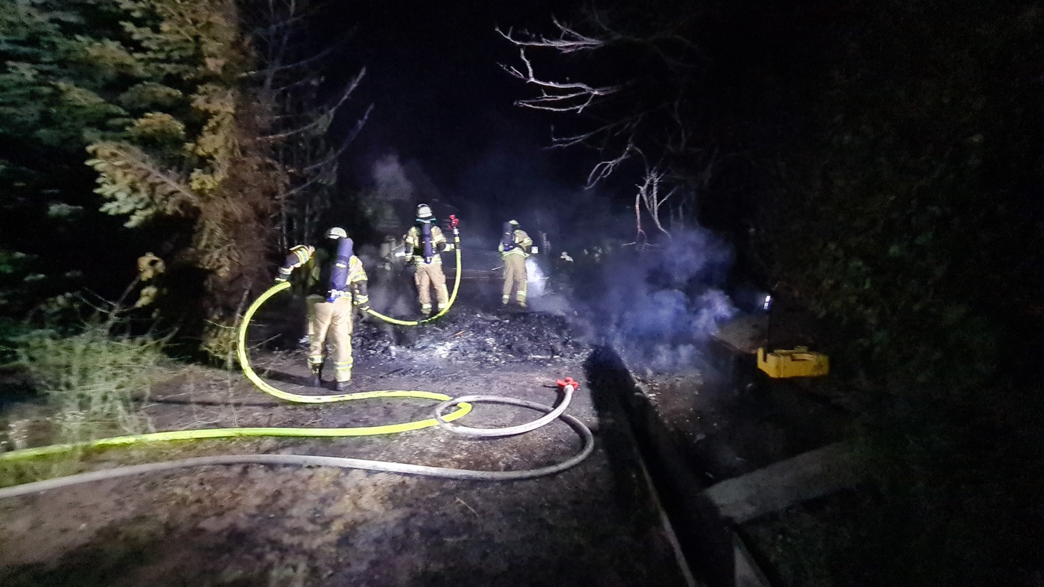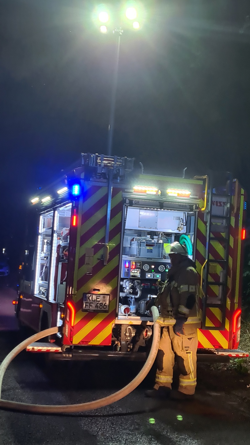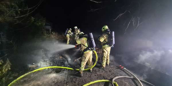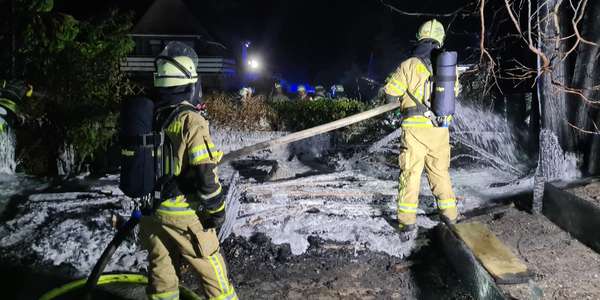 Gegen 23:41 Uhr meldete ein aufmerksamer Nachbar auf der Heidestraße im Ortsteil Donsbrüggen der Leitstelle der Feuerwehr, dass er Funkenflug und Brandrauch aus dem Nachbarsgarten vernommen habe. Diese alarmierte daraufhin den LZ West (bestehend aus dem Löschzug Rindern und der Löschgruppe Donsbrüggen). Bereits auf der Anfahrt informierte die Leitstelle die anrückenden Einheiten, dass mehrere Anrufer bei der Leitstelle ein großes Feuer gemeldet haben. Beim Eintreffen der ersten Fahrzeuge befand sich eine Gartenhütte und die angrenzende Vegetation bereits in Vollbrand und das Feuer drohte auf die umliegenden Gärten sowie den angrenzenden Wald überzugreifen. Daher übernahmen sofort zwei Trupps unter umluftunabhängigem Atemschutz die Brandbekämpfung, um eine weitere Brandausbreitung zu vermeiden. Ein weiterer Trupp sicherte die Wasserversorgung. Parallel dazu wurden die Löschzüge Kleve und Kellen nachalarmiert, um der Gefahr eines möglichen Waldbrandes direkt entgegenstehen können. Zeitgleich kontrollierten weitere Einsatzkräfte die angrenzenden Nachbarsgärten und den Wald auf Glutnester oder eine weitere Brandausbreitung. Abschließend wurde der Brandschutt mit einem Schaumteppich belegt, um ein erneutes Entfachen potentieller Glutnester gänzlich ausschließen zu können. Im Anschluss konnten die ca. 53 Einsatzkräfte unter Leitung von Brandoberinspektor Daniel Kuhnke ihren Einsatz gegen ca. 02:05 Uhr beenden.