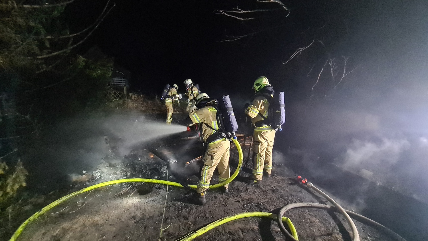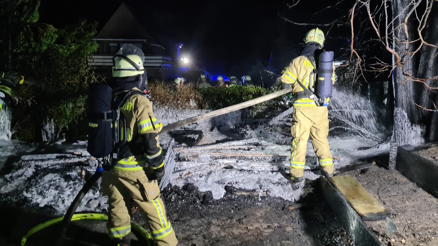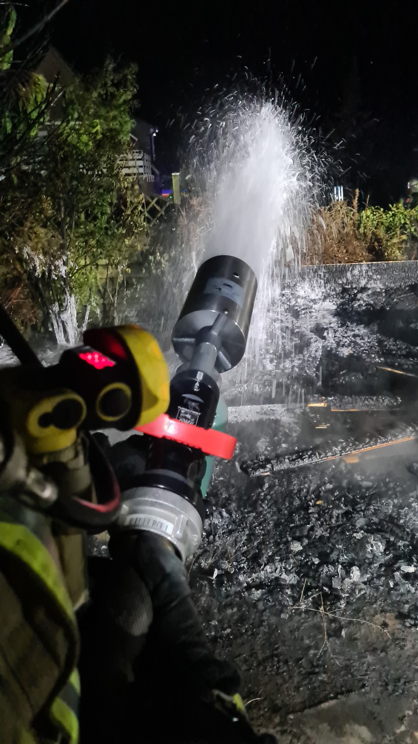 Gegen 23:41 Uhr meldete ein aufmerksamer Nachbar auf der Heidestraße im Ortsteil Donsbrüggen der Leitstelle der Feuerwehr, dass er Funkenflug und Brandrauch aus dem Nachbarsgarten vernommen habe. Diese alarmierte daraufhin den LZ West (bestehend aus dem Löschzug Rindern und der Löschgruppe Donsbrüggen). Bereits auf der Anfahrt informierte die Leitstelle die anrückenden Einheiten, dass mehrere Anrufer bei der Leitstelle ein großes Feuer gemeldet haben. Beim Eintreffen der ersten Fahrzeuge befand sich eine Gartenhütte und die angrenzende Vegetation bereits in Vollbrand und das Feuer drohte auf die umliegenden Gärten sowie den angrenzenden Wald überzugreifen. Daher übernahmen sofort zwei Trupps unter umluftunabhängigem Atemschutz die Brandbekämpfung, um eine weitere Brandausbreitung zu vermeiden. Ein weiterer Trupp sicherte die Wasserversorgung. Parallel dazu wurden die Löschzüge Kleve und Kellen nachalarmiert, um der Gefahr eines möglichen Waldbrandes direkt entgegenstehen können. Zeitgleich kontrollierten weitere Einsatzkräfte die angrenzenden Nachbarsgärten und den Wald auf Glutnester oder eine weitere Brandausbreitung. Abschließend wurde der Brandschutt mit einem Schaumteppich belegt, um ein erneutes Entfachen potentieller Glutnester gänzlich ausschließen zu können. Im Anschluss konnten die ca. 53 Einsatzkräfte unter Leitung von Brandoberinspektor Daniel Kuhnke ihren Einsatz gegen ca. 02:05 Uhr beenden.