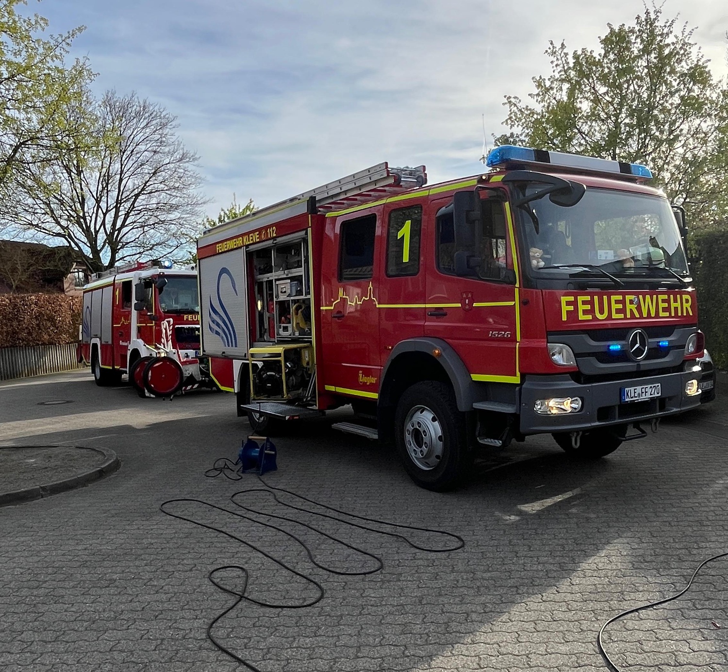 Am 8. April 2026 wurde der Löschzug Kleve um 17:39 Uhr mit dem Stichwort „Wasserschaden“ in die Straße Brammenfeld alarmiert. Der Anrufer meldete etwa 30 cm hoch stehendes Wasser im Keller eines Einfamilienhauses.