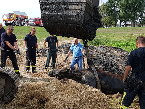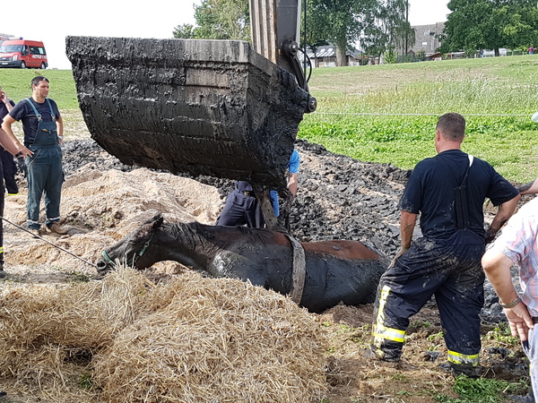 Das Vordringen zu den eingesunkenen Pferden war wegen des aufgeweichten Bodens sehr schwierig. Der herbeigerufene Tierarzt konnte zunächst nur per Schlauchboot an die Tiere heran. Jetzt war Kreativität gefragt: Es wurden durch ein ortsansässiges Tiefbauunternehmen mehrere Bagger an der Einsatzstelle zur Verfügung gestellt. Auch Metallplatten zur Stabilisierung des Untergrundes wurden angefordert. Gegen 12:50 Uhr konnte dann das erste Tier mit Hilfe eines Kettenbaggers aus dem Kolk gezogen werden. Das zweite Pferd konnte schließlich gegen 14:00 Uhr befreit werden.