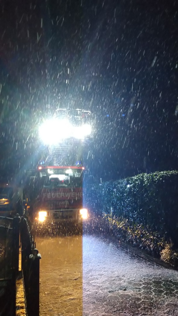 Zwei Atemschutztrupps gingen zur Erkundung in das Wohnhaus vor. Dabei fiel auf, dass bereits Brandrauch aus einer Revisionsklappe im Obergeschoss drang. Das Brandgut wurde aus dem Kaminofen entfernt und mit Hilfe der Drehleiter aus Materborn wurde der Kamin von oben gekehrt. Die herabfallende Glut wurde im Kellergeschoss aufgefangen und abgelöscht. Um zu verhindern, dass sich Brandrauch im Gebäude ausbreitet, wurden ein Überdrucklüfter und ein Rauchschutzvorhang eingesetzt. Nachdem die Luft in den betroffenen Räumen über ein Mehrgasmessgerät kontrolliert wurde, konnte das Gebäude gegen 19:50 Uhr direkt wieder an den Eigentümer übergeben werden.