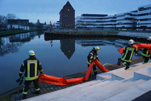 Der Ölfilm erstreckte sich zwischen Hafenstraße und Hochschulgelände. In diesem Bereich gibt es mehrere Einläufe aus dem Regenwasserkanalnetz. Der Ursprung der Verschmutzung konnte gestern nicht eindeutig geklärt werden. Im einstündigen Einsatz waren 18 Einsatzkräfte des Löschzugs Kleve unter der Leitung von Stadtbrandinspektor Ralf Benkel, sowie die Untere Wasserbehörde und das Ordnungsamt.