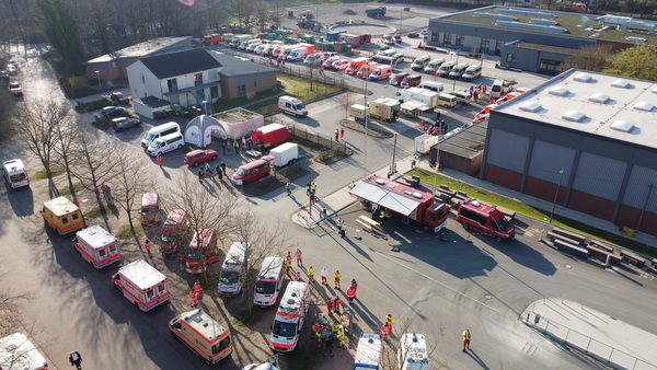 - 2021-03-31 09:50 Uhr Auch der Bereitstellungsraum hinter dem Berufskolleg ist einsatzbereit. Von hier aus wird u. A. der Transport der Personen koordiniert, die den Absperrbereich nicht eigenständig verlassen können. Die Sondierung des Fundortes verzögert sich leider gerade noch etwas.