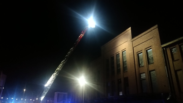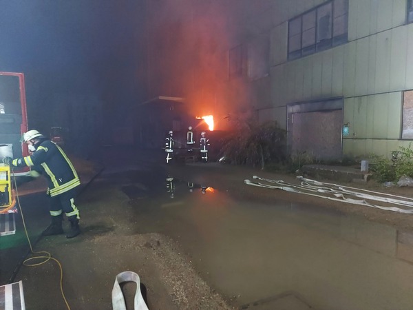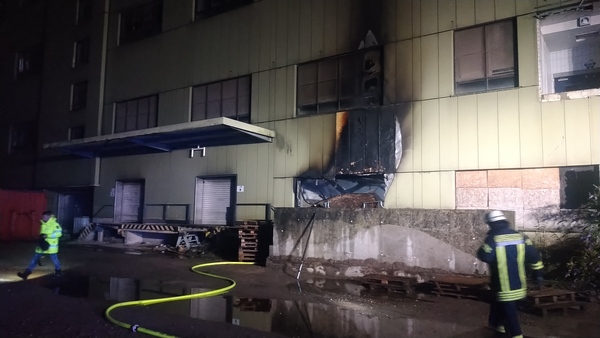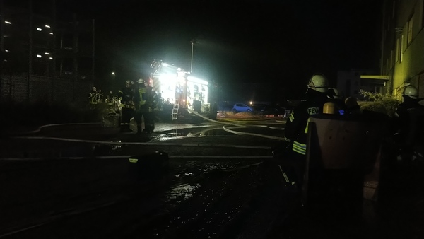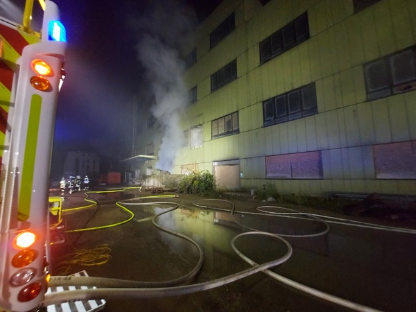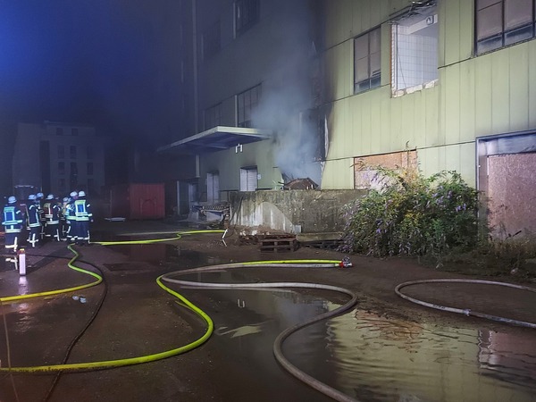 Auf der Rückseite des Fabrikgebäudes brannte es beim Eintreffen der Feuerwehr in einem Raum im Erdgeschoss. Die Flammen schlugen aus einem Fenster die Fassade hoch. Brandrauch hatte sich in großen Teilen des Gebäudes verteilt und drang bereits aus Fenstern an einer anderen Gebäudeseite ins Freie. Fünf Trupps unter Atemschutz gingen zur Brandbekämpfung von innen und außen vor und konnten den Brand schließlich löschen.