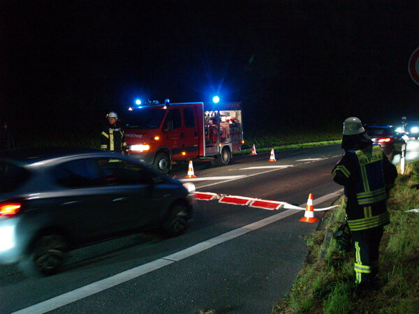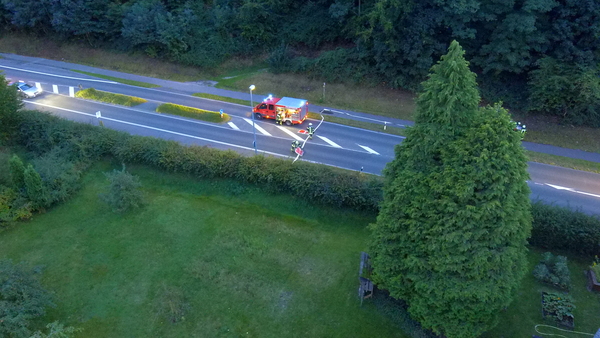 Eine besondere Herausforderung war die Wasserversorgung. Da der Unterflurhydrant auf der gegenüberliegenden Seite der Tiergartenstraße lag, musste eine lange Wegstrecke überbrückt werden, was im ersten Moment viele Einsatzkräfte beschäftigte. Eine Schlauchleitung musste zudem quer über die Fahrbahn der Bundesstraße gelegt werden. Zum Schutz des Schlauches und zum sicheren Überfahren wurden sogenannte Schlauchbrücken eingesetzt.