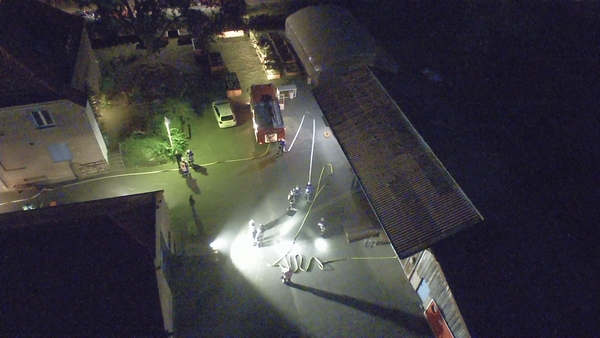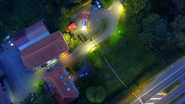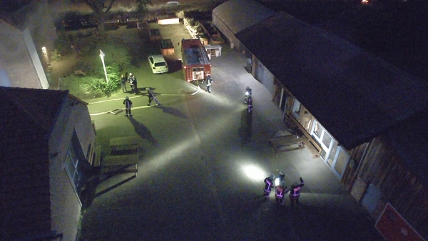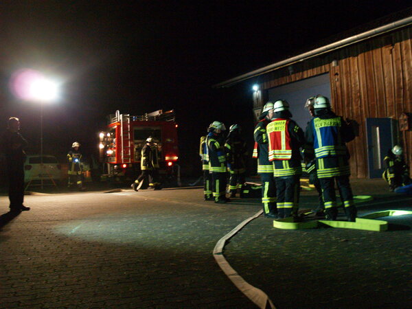 Der Jägerhof besteht aus mehreren Gebäuden, in denen sich auch Werkstätten und Ausbildungsräume befinden. Das Übungsszenario sah vor, dass sich in der Werkstatt im hinteren Gebäude eine Staubexplosion ereignet haben sollte. Brennende Teile waren daraufhin auf ein anderes Gebäude niedergegangen, so dass sich auch dort ein Brand entwickelte. Nach der Erkundung durch den Zugführer wurden mehrere Trupps unter Atemschutz zur Menschenrettung und Brandbekämpfung in den unterschiedlichen Gebäuden eingesetzt. Die zunehmende Dämmerung erforderte zudem den Aufbau von Beleuchtungsmaterial.