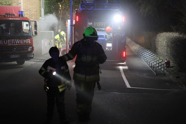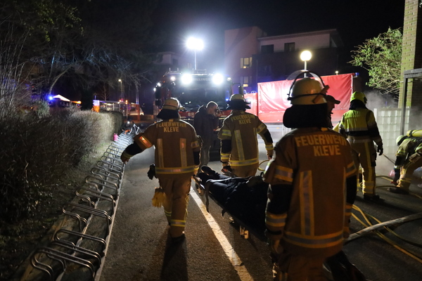 Doch nun zum Übungsszenario. Im Rahmen der Übung bekamen die beiden Einheiten die Meldung, dass es in einer fiktiven Unterkunft für Obdachsuchende zu einer Rauchentwicklung gekommen sei. Bei Eintreffen der ersten Einheiten fand Löschzugführer Jan-Peter Fruhen vom Löschzug Rindern eine sehr unübersichtliche Lage vor: So gab es an mehreren Stellen im Außenbereich brandverletzte Personen, die es zu retten galt. Des Weiteren befanden sich nach Aussage eines Brandverletzten noch sechs Personen im Inneren des Gebäudes. Zusätzlich waren noch zwei verletzte Personen auf dem Dach der benachbarten Umkleide einer Sportanlage, die ebenfalls auf Rettung warteten. Aufgrund der Vielzahl der verletzten Personen wurde daher umgehend der Malteser Hilfsdienst aus Kleve nachgefordert, um bei der Abarbeitung dieses sogenannten „Massenanfalles von Verletzten“ zu unterstützen.