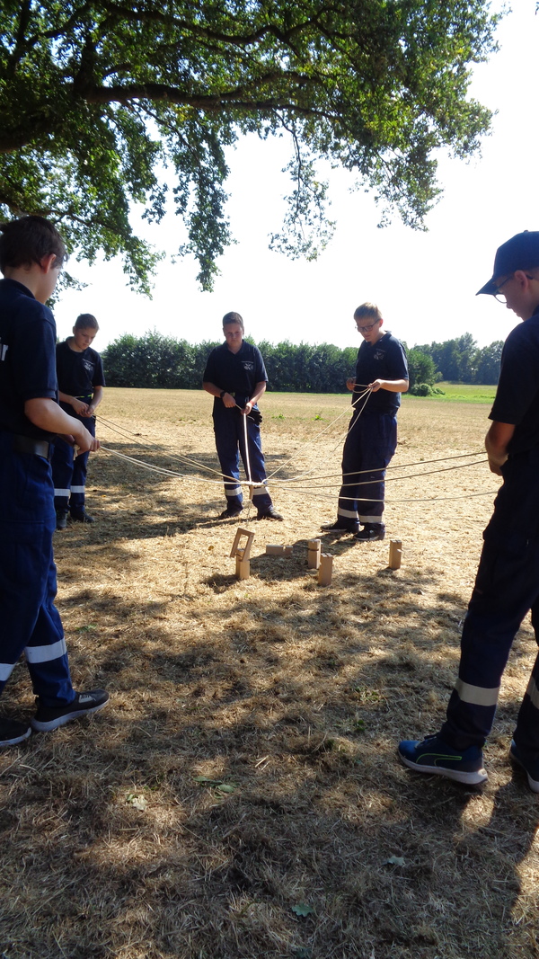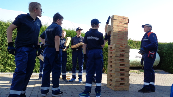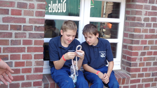 Um 8 Uhr morgens startete die Gruppe aus Kleve von der Feuerwache in Kleve Richtung Straelen/Auwel-Holt. Für den Nachwuchs der Feuerwehr ging es um Spiel, Spaß und gute Laune. So musste beispielsweise ein riesengroßer Jengaturm gebaut werden und es musste eine Strecke über Getränkekisten zurückgelegt werden, ohne dass die Füße den Boden berührten. Knoten und Stiche standen ebenfalls auf dem Programm. Auch für die Verpflegung war bestens gesorgt: Es gab Köstlichkeiten aus dem Pommeswagen. Platz zum Spielen und Toben war auf dem Schulhof reichlich vorhanden.