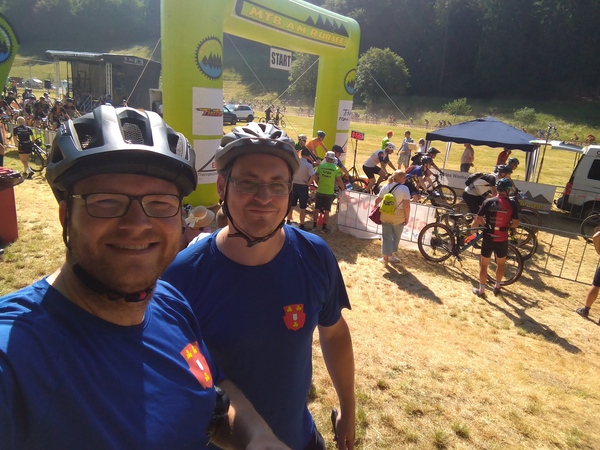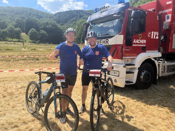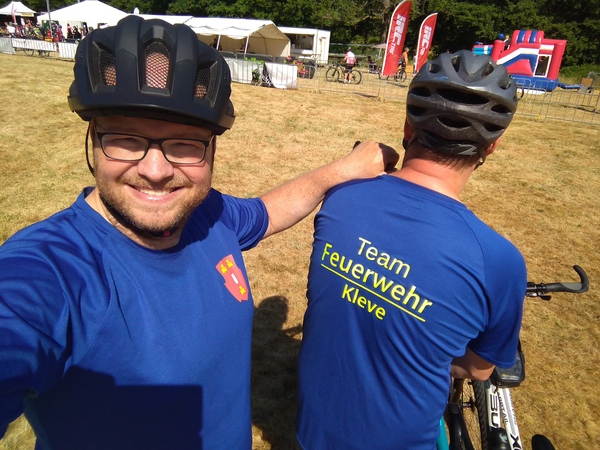 Andreas Abels und Florian Pose sind beide in der Löschgruppe Reichswalde aktiv und trainieren regelmäßig mit dem Mountainbike im Reichswald. Als die zwei dann Ende März die Einladung der Feuerwehr Aachen zur landesweiten Feuerwehr-Meisterschaft auf dem Dienstweg über den Kreisbrandmeister erreichte, waren sie gleich interessiert: „Die 50 km haben uns nicht beeindruckt, wohl aber die 1200 Höhenmeter.“, so Brandinspektor Florian Pose. „Wir haben hier zwar den niederrheinischen Höhenzug, der über Kleve durch den Reichswald bis nach Nimwegen verläuft, aber die Eifel ist nochmal eine andere Hausnummer.“. Entsprechend stolz waren die beiden, die Strecke gemeistert zu haben. Sie belegten in ihrer Altersklasse den 14. und 15. Platz. Die Temperaturen nahe der 30-Grad-Marke forderten allen Beteiligten viel ab. Neben vielen Helfern und Streckenposten war auch das technische Hilfswerk vertreten, um die Fahrer unterwegs mit ausreichend Trinkwasser zu versorgen.