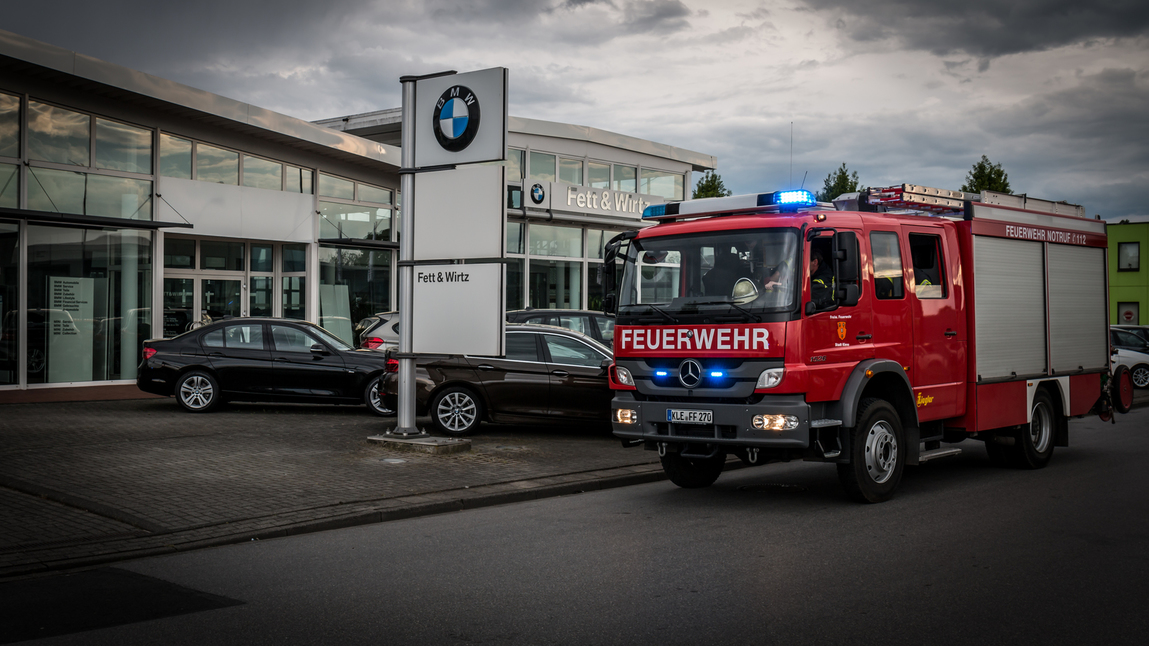 Anlass der Übung war unter Anderem der Neubau einer Halle der Firma Fett & Wirtz Automobile GmbH & Co. KG im Klever Industriegebiet, die Werkstätten und ein zweigeschossiges Reifenlager beherbergt. Diese Art von Objekt erfordert wegen der Art der Brandlast eine besondere Aufmerksamkeit der Feuerwehr. Durch eine Übung vor Ort konnte man das Gebäude und die örtlichen Gegebenheiten bestmöglich kennenlernen.