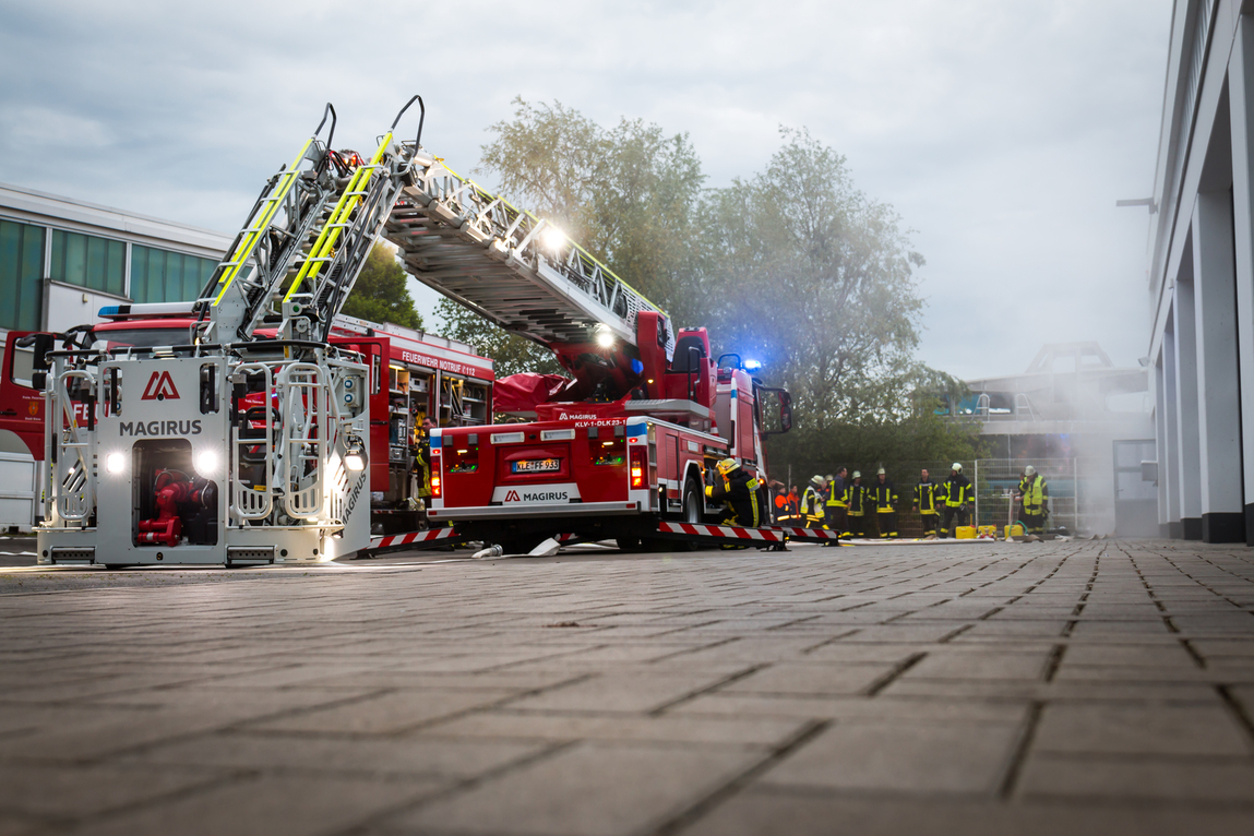 Ausgangssituation der Einsatzübung war ein Feuer in der neuen Halle. Der Brandrauch wurde mit Hilfe von Nebelmaschinen simuliert, die vermissten Personen wurden von den engagierten Mitgliedern der Jugendfeuerwehr Kleve dargestellt.